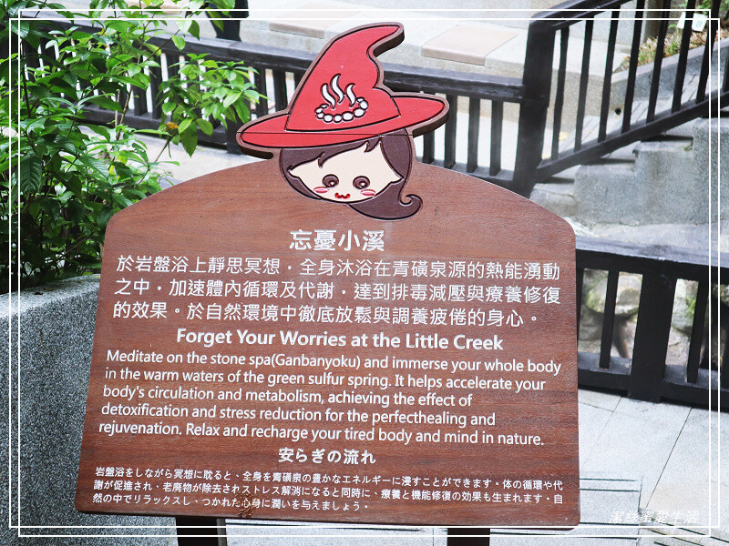 再往前走到了忘憂小溪,這裡很特別的是旁邊有一排岩盤,目的是坐在其上靜思冥想,沐浴在青磺泉源的熱能中,在大自然放鬆疲倦的身心靈。