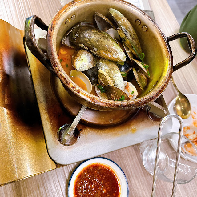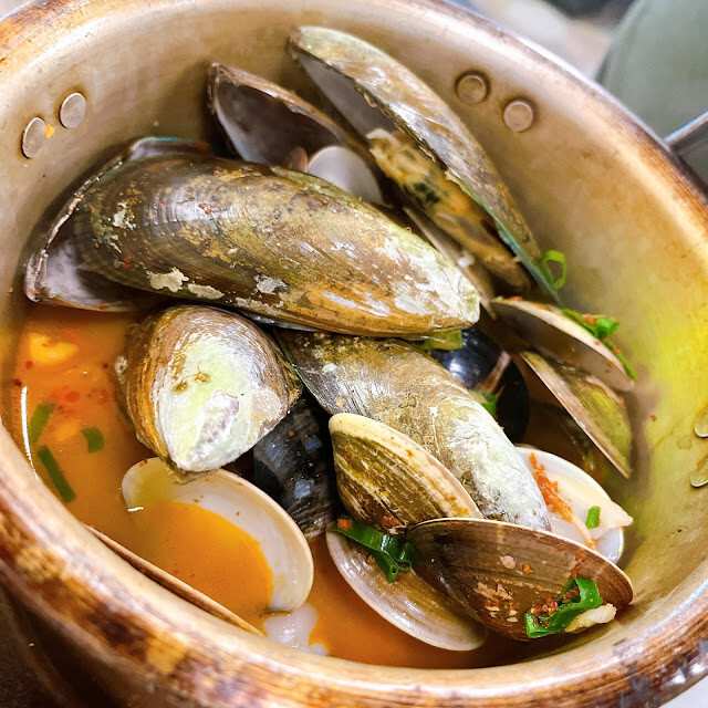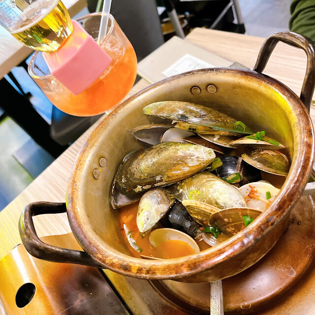 這道由蛤蠣加上淡菜燒酒組成的燒酒蛤兩吃,貝類海鮮肉質超飽滿,又鮮又甜,彷彿聽到海洋的吶喊,吃完貝類後,服務生會倒入蔥花、米飯、辣椒粉,熬成鮑魚粥。這粥的滋味真的是堪稱一絕,鮮味濃郁、辣勁十足,吸收了湯汁的精華,鎖住了大海鮮甜的滋味,讓五臟六腑有了暖暖的飽足感。