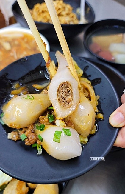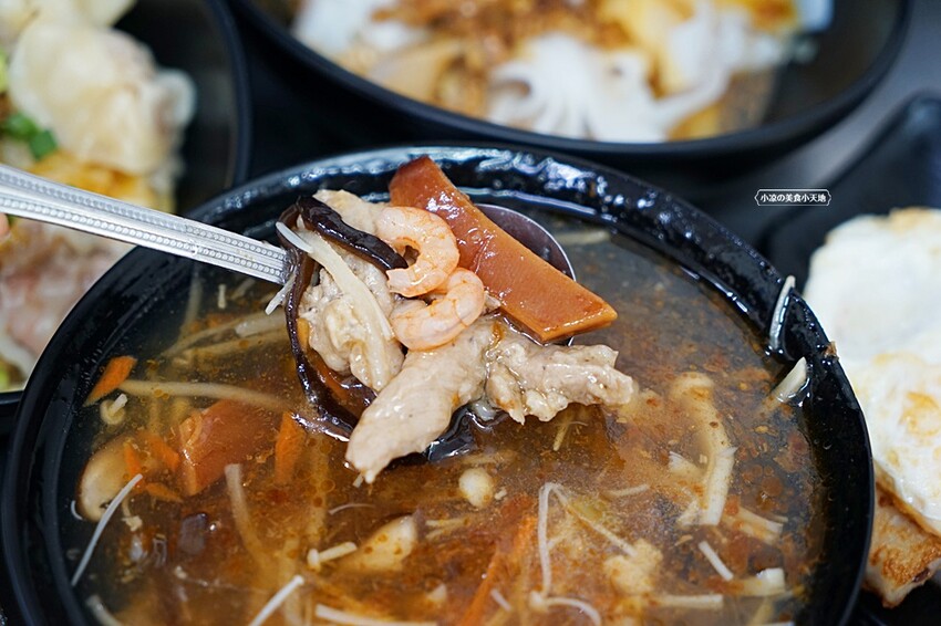 綜合羹內的赤肉羹肉也是店家自己做的,不假他人之手,所以你會發現在給料這方面相當的大方。這邊的羹湯帶了點沙茶味道不會過於勾芡,加上給了不少菇類、黑木耳絲、爽脆的魷魚、彈牙的蝦仁等,整體來說這綜合羹竟清爽又具豐富口感,小凉相當的推薦大家試試唷!