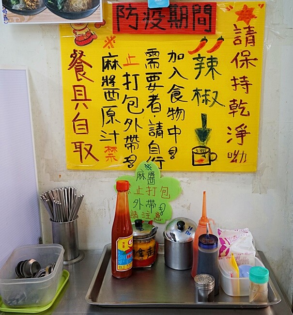 內用醬料區,有台中麵店必備東泉辣椒醬、特製辣醬、自製麻醬(禁止外帶打包)、胡椒、醬油等調味料。內用餐具需自取~