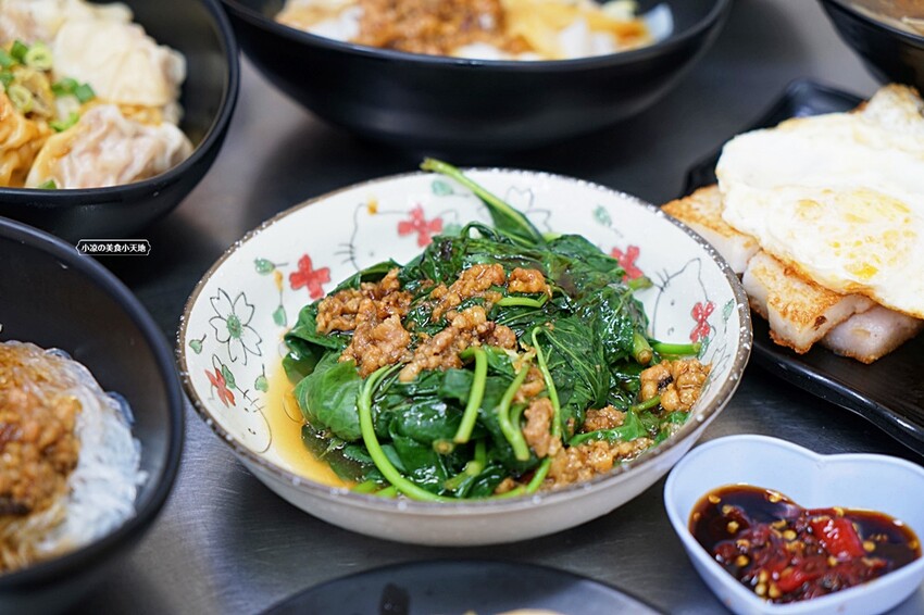 燙地瓜葉上面淋上獨門的肉燥,單純燙青菜配肉燥這樣吃就很有味道。