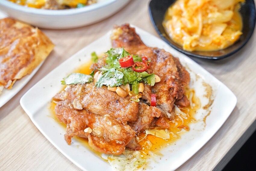 看得出椒麻雞炸至金黃酥脆,上層再撒上花生、淋上泰式椒麻酸辣醬來提味,整體肉質還算鮮嫩多汁!