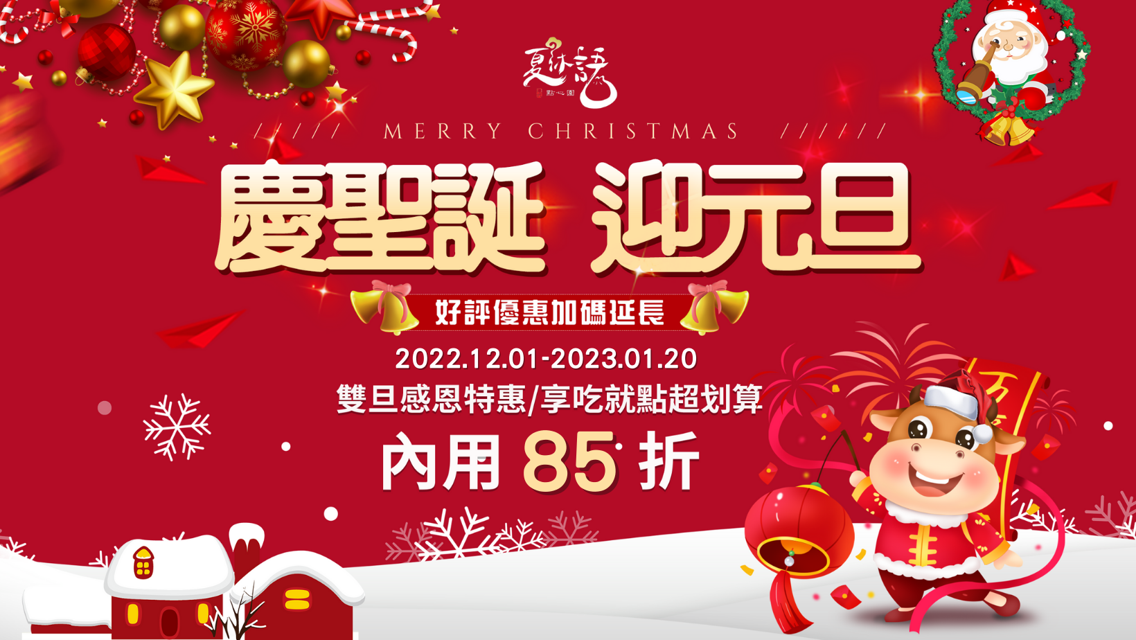 慶聖誕節、迎元旦超殺優惠來了!2022/12/1~2023/1/20,內用全面85折優惠,真的超級划算,趕緊訂位訂起來!