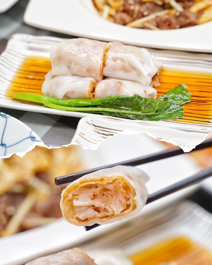 有著白裡透黃的外表是「腐皮蝦腸粉」,河粉包入一層腐皮,中間則是飽滿蝦仁內餡,除了蝦子的鮮甜味之外,還有炸豆皮香氣,搭配鹹香的醬汁更有層次感。
