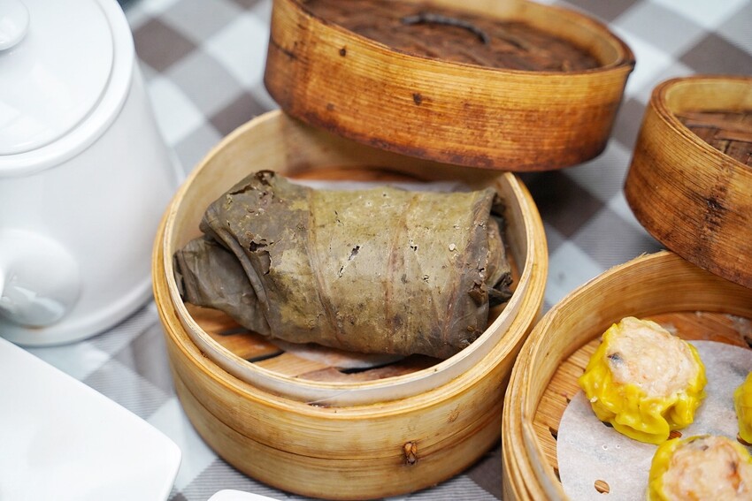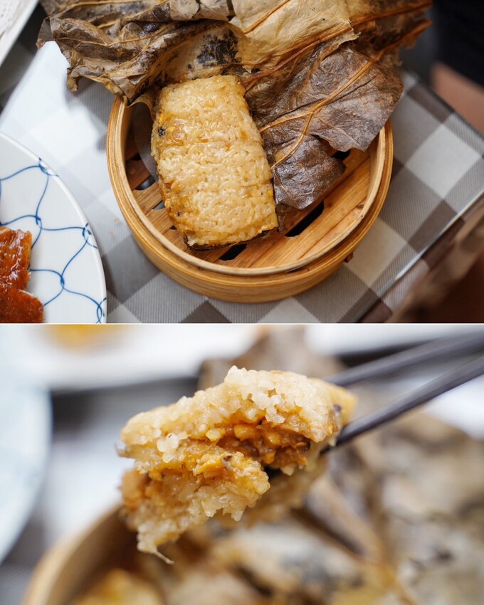 一層層剝開「荷葉糯米雞」,不時飄出荷葉香氣,裡頭是Q軟的糯米加上鮮蝦、香菇、肉塊、鹹蛋黃等配料,入口有荷葉、紅蔥頭、乾香菇的香氣,比起粽子,味道更清香一些,整體也是好吃的。