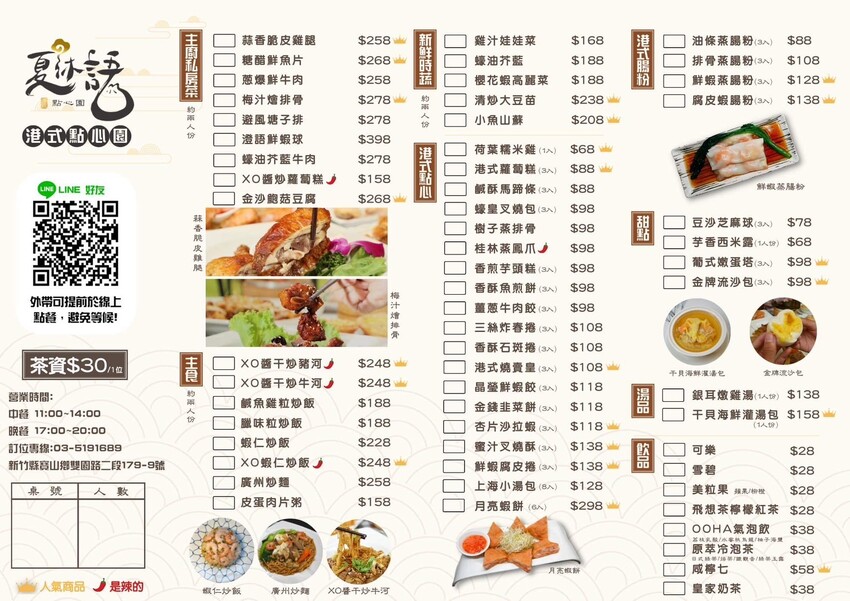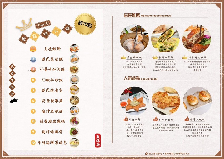 不知道點什麼沒關係!「夏沐語港式點心園」店內有人氣排行可以參考,個人推薦必點月亮蝦餅、荷葉糯米雞、蜜汁叉燒酥、OX醬干炒河粉、腐皮蝦腸粉及港式燒鴨,另外這裡的港點都是一份三入喔。