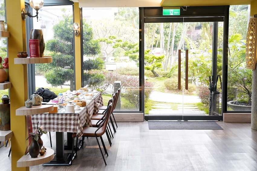 餐廳門口前有充滿熱帶風情的旅人蕉及棕梠樹,餐廳內部裝潢走簡約家庭式風格,靠窗落地窗的座位還能看到峇里島villa風格的造景,其中還有峇里島當地特有的善惡門、雞蛋花石板雕刻,彷彿置身在國外的感覺,格外愜意呢。