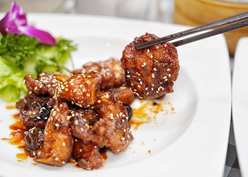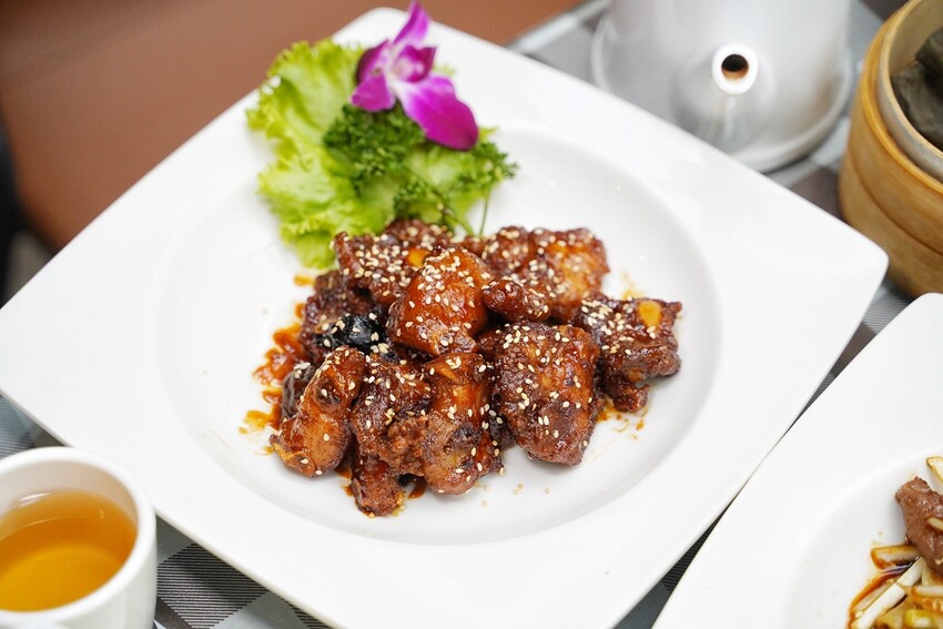 「梅汁燴排骨」選用豬小排部位以先炸後燒方式料理,深褐色的排骨在白色的芝麻點綴下顯得更誘人食慾,吃起來梅香四溢,酸酸甜甜挺開胃下飯的,喜愛糖醋系列菜餚的你,肯定會很喜歡這道菜。
