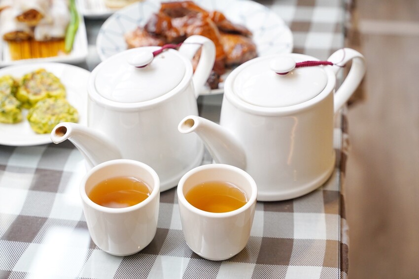吃港點一定要配茶才對味!入座後會依照人頭酌收30元茶資費用,可選擇無咖啡因的「養身枸杞茶」或是使用台灣茶葉沖泡出的「蜜香紅茶」,枸杞茶甘甜暖胃,紅茶香而不苦澀,兩款都好喝,而且還可以續壺唷!