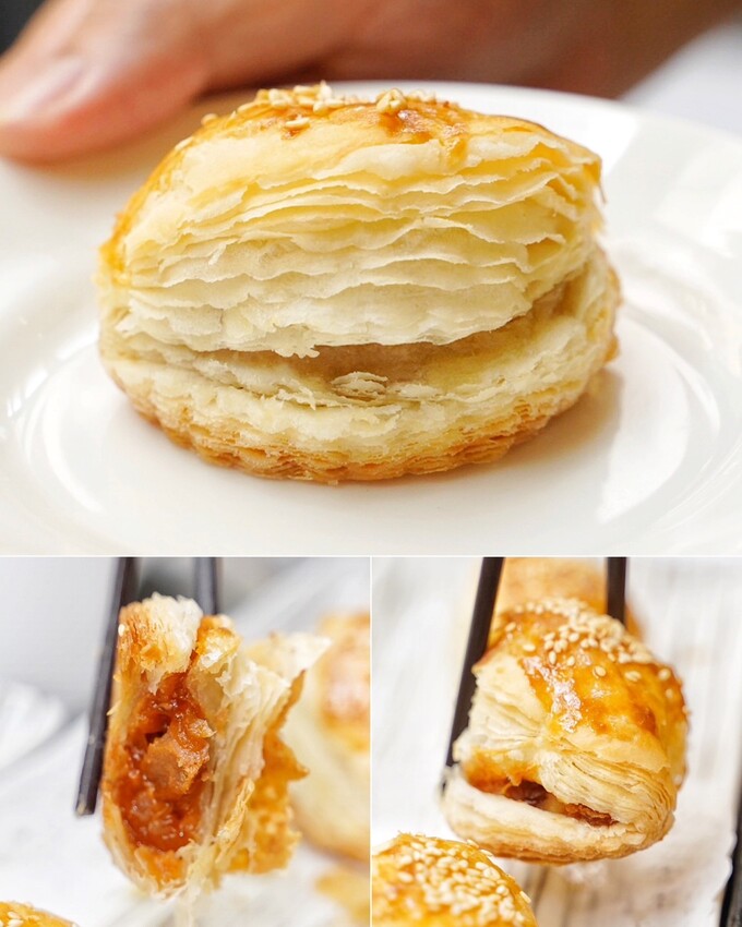 「蜜汁叉燒酥」表層刷上蛋液後烤至金黃色澤,多層次的酥皮光看外表就覺得厲害。
