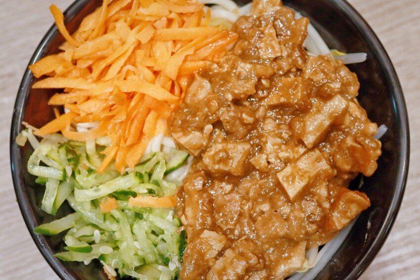 有瘦肉、豆干、小黃瓜、紅蘿蔔、豆芽等,整體搭配起來很豐富,均勻攪拌後麵條也不會太爛,裹著鹹香有味的醬汁配料一起吃,不免讓人一口接著一口。