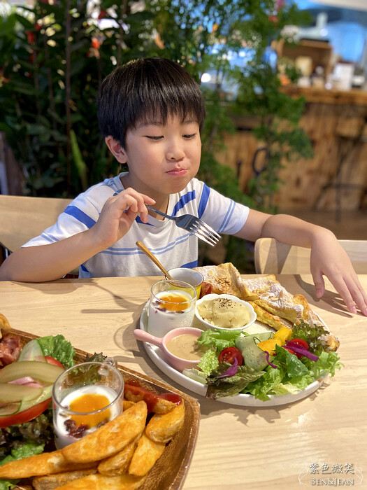 這份很精采吧!! 生菜可不是一般的幾片生菜葉而已,而是多樣蔬菜水果的組合,培根、自製乳酪,自製薯泥、當然還有主角-法式土司