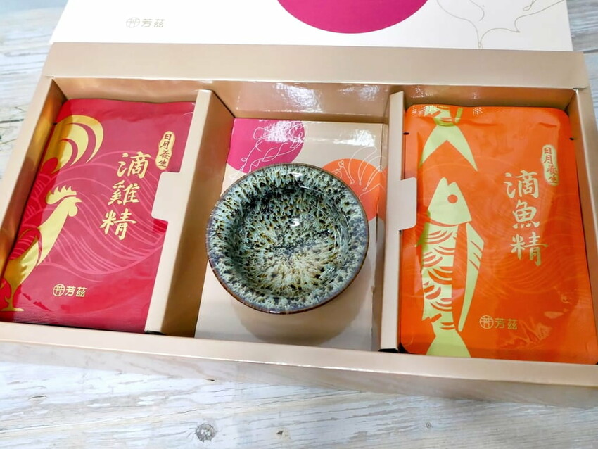 另外還有一個高質感的天目釉品茗杯.一包滴雞精的量.倒入品茗杯裡剛剛好.想補充營養不用再另外找其他杯子裝. 是個相當貼心的組合~