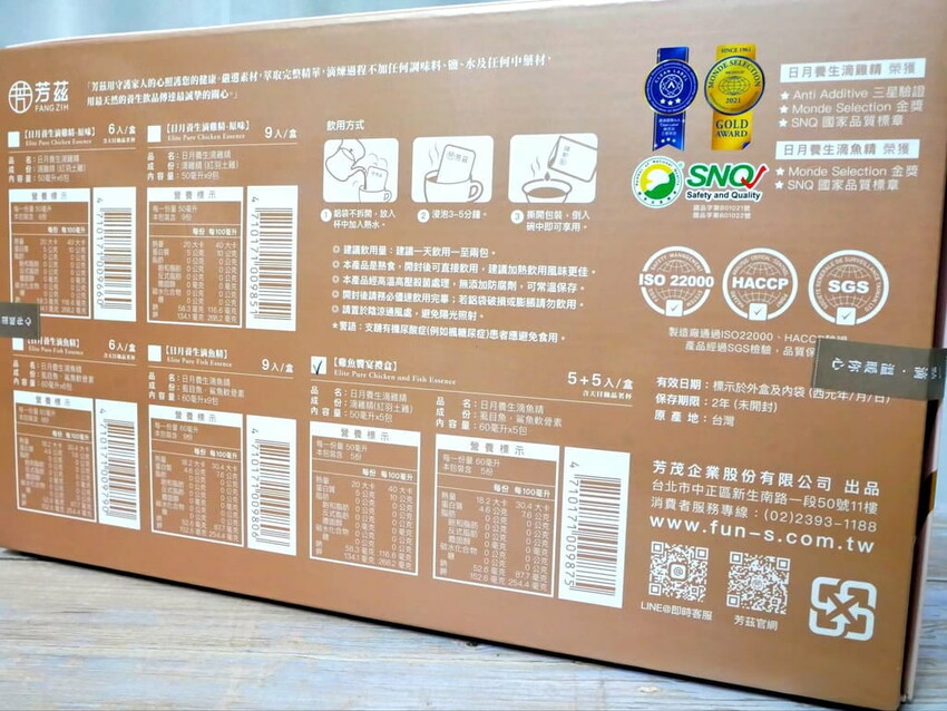 芳茲滴雞精經過多項SGS檢驗合格. 也是業界唯一榮獲SNQ國家品質標章、國際A.A.無添加三星驗證、Monde selection金賞與工研院銀髮友善標章等四項國內外殊榮滴雞精認證