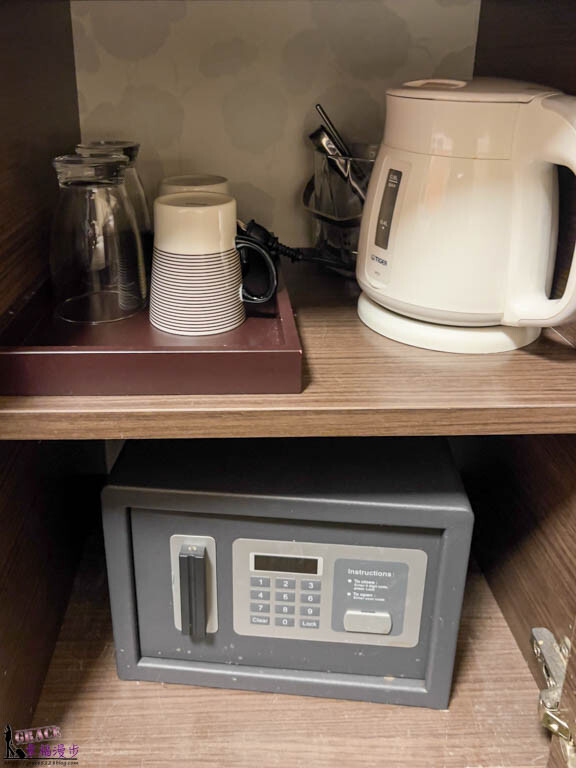 櫃子裡面有著熱水壺、杯子等,還備有咖啡和茶包,裡面有著保險櫃供旅客使用,只是這保險櫃的地方沒有清掃的很乾淨。