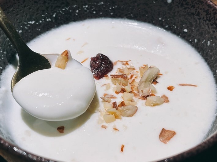 奶香十足的溫熱杏仁露,上面撒了堅果與果乾.