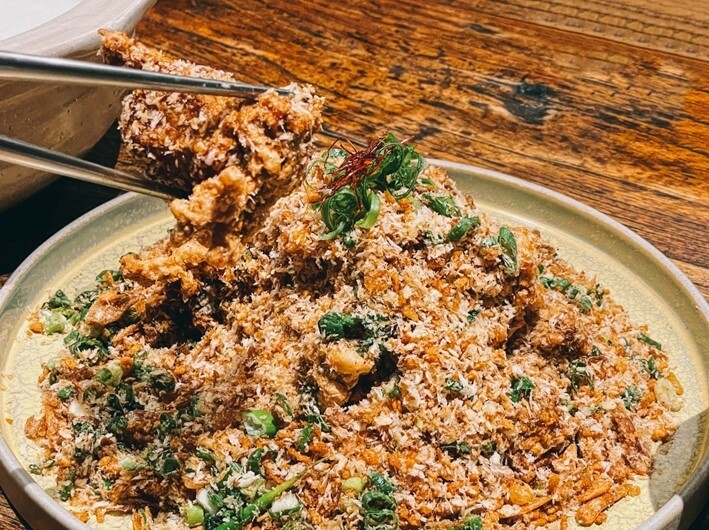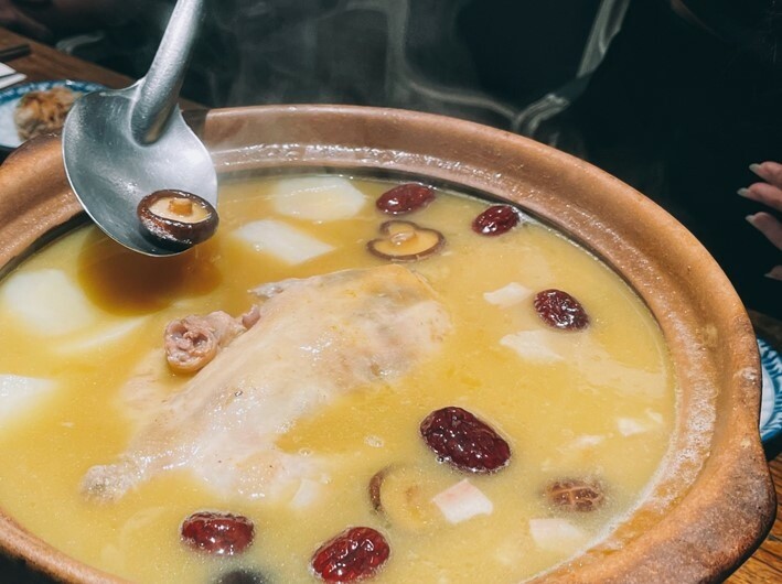 招牌的黃金雞湯是用雞湯熬製的雞湯,聽起來很饒口但事實就是如此.一般我們會使用清水加上輔料與全雞熬製.但春韭不使用清水,而更費工用多隻雞與金華火腿熬出來的高湯,加上豬腳,干貝,淮山,香菇,紅棗,再放入一隻全雞精心熬製到豬腳幾近化開,雞肉筷子輕夾就骨肉分離..雞湯鮮甜濃郁,入口在唇齒間微微沾黏,果真是招牌!