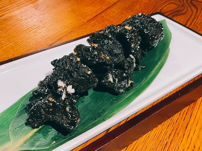 用墨魚調製的麵糊輕輕的裹在石斑上酥炸,師傅火候掌握得非常好,酥薄的外殼輕輕咬下破裂在口中的是細嫩的魚肉還有古古的魚鮮.為了更提升口味跟去除那幾乎察覺不出的油膩,外面晶瑩的是香甜爽口的芒果糖漿.