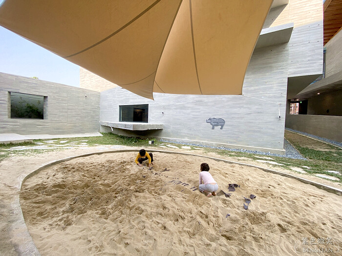 第3場館旁的小沙池,這裡是園區特別規劃的挖掘體驗區,可以讓親子一同來體驗埋藏在沙堆裡的犀牛骨骼化石,用手將沙挖開就好了,很有趣!! 一旁也有水龍頭可以洗手