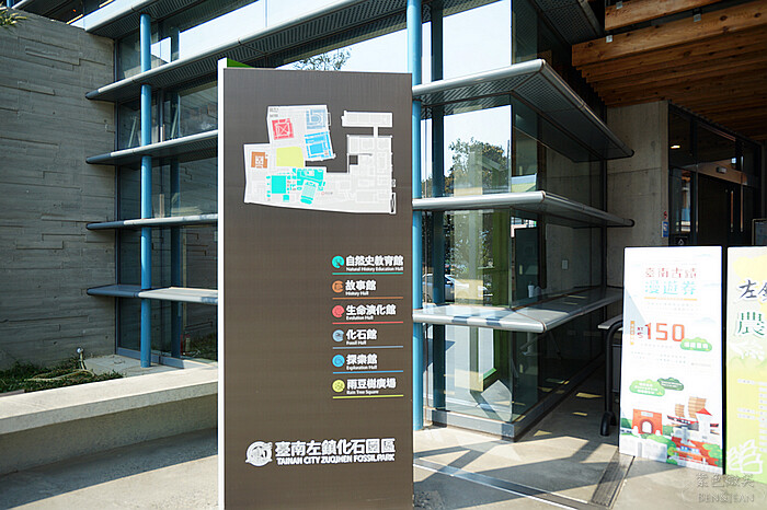台南左鎮化石園區共分成自然史教育館、故事館、生命演化館、化石館、探索館5個展館及戶外雨豆樹廣場,總面積有1800坪,館藏4600件物品。