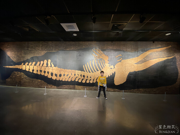 一旁牆上有著大鯨魚的剪影圖,還有鯨魚的骨骼結構圖。