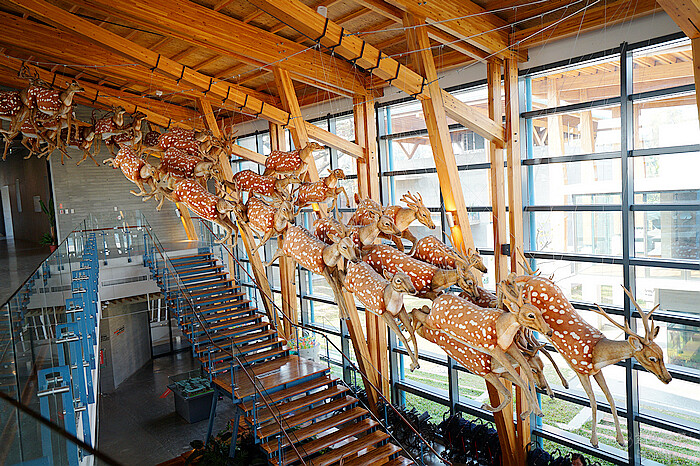 來這裏沿著動線就可以玩的很盡興了,一入館內立馬看到大廳上方有著群鹿奔騰的設計,令人眼睛為之一亮啊,如果站在二樓的特展區往下望去,這群鹿更栩栩如生哦。