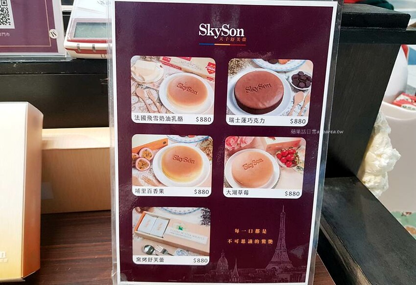 傳統的法式舒芙蕾在全台做外帶的只有SkySon天子舒芙蕾,每日新鮮出爐,原料使用澳洲頂級乳酪、日本鑽石牌麵粉、台灣本土100%鮮乳、台灣本土雞蛋等製成,製作耗工費時,每日限量販售,如果要大量購買記得一定要先預訂,避免撲空。