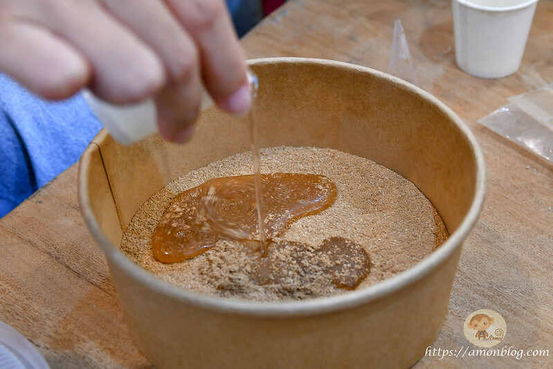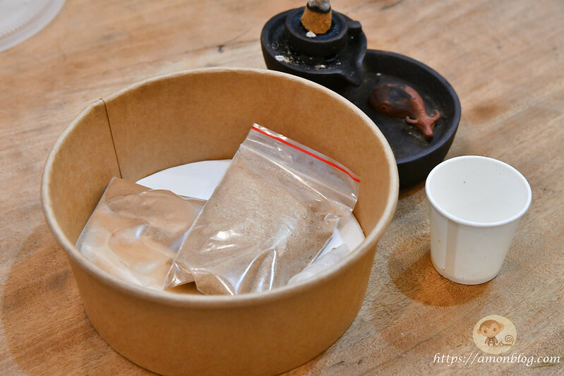 DIY香椎體驗其實還蠻好上手的,大人小孩都可以很輕鬆體驗,現場會有工作人員一步步帶領教學,也不用擔心跟不上步驟,材料就是將牛樟木粉、紅檜木粉、肖楠木粉等,一開始先將這些粉末到入盒子中混合均勻。