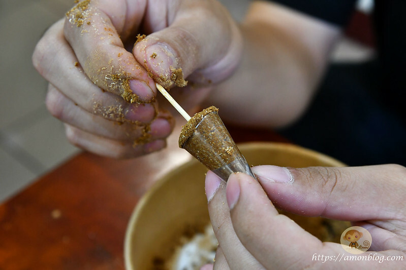 除了米彩繪DIY之外,還有手作三角飯糰DIY,這個DIY也很簡單,將白飯填入到三角型塑膠模具內,接著加入好吃的肉鬆和美乃滋,再覆蓋上一層白飯後壓實壓牢,接著將模具倒扣在海台片上,讓模具內的白飯脫離模具,迅速的包起來就完成了,可以直接吃也可以帶走當點心,做完後會還蠻有成就感的唷。