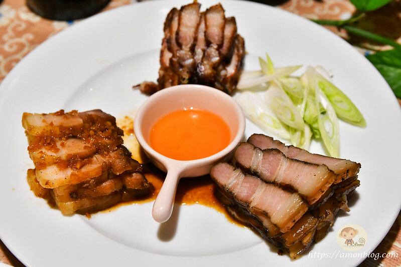菜單上的客家料理不少,而這個客家拼盤就是有蒜泥白肉、鹹豬肉、紅槽炸肉,三種願望一盤滿足,搭配的醬汁也是店家自製的,我個人覺得蒜泥白肉和紅槽炸肉都好吃XDD。