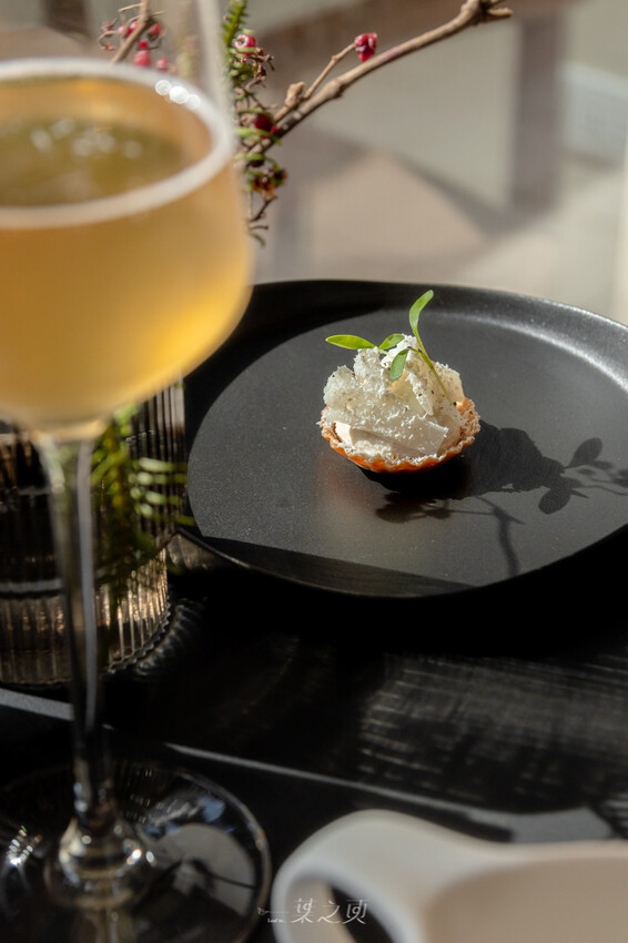 搭配的pairing有兩杯,搭配開胃小點和第一道前菜的,是 P&T N°322 帕坦綠茶康普茶/綠豆蔻/白胡椒/氣泡水,有點香檳的感覺,綠豆蔻和白胡椒的香料氣息點到為止,口感風味都很清爽,我個人還蠻喜歡的。