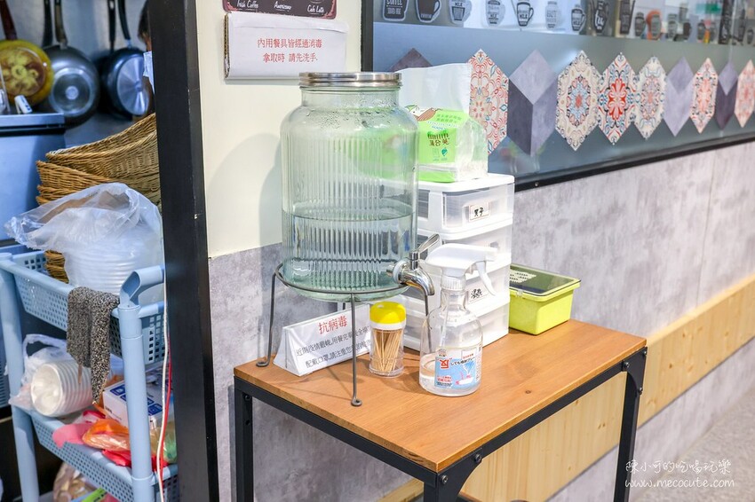 自助區提供飲用水跟餐具,還有消毒用的酒精。