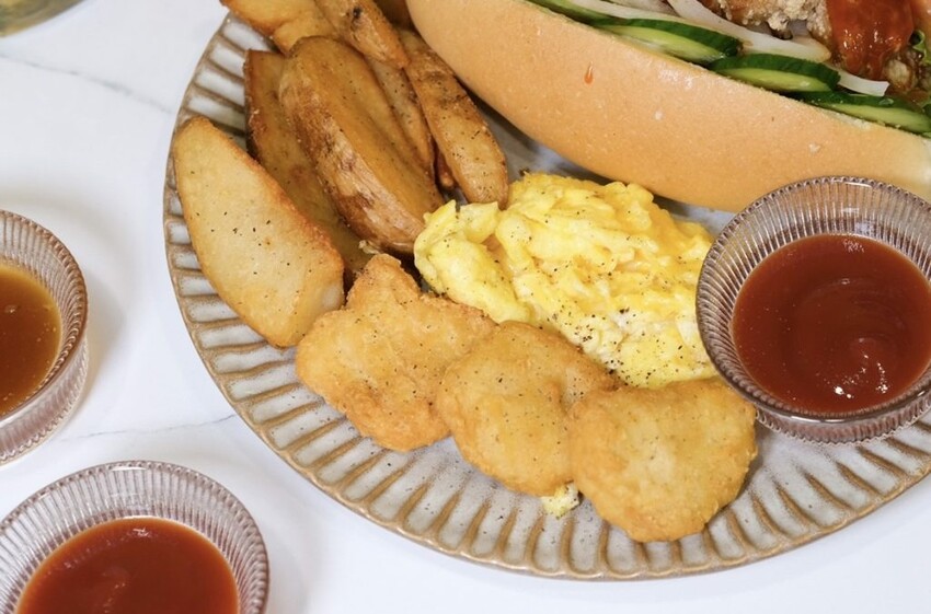 ▼升級套餐包含原味茶品、雞塊、薯塊和炒蛋, 豐盛的食材將盤子塞得滿滿,無論是營養還是飽足感都很夠。