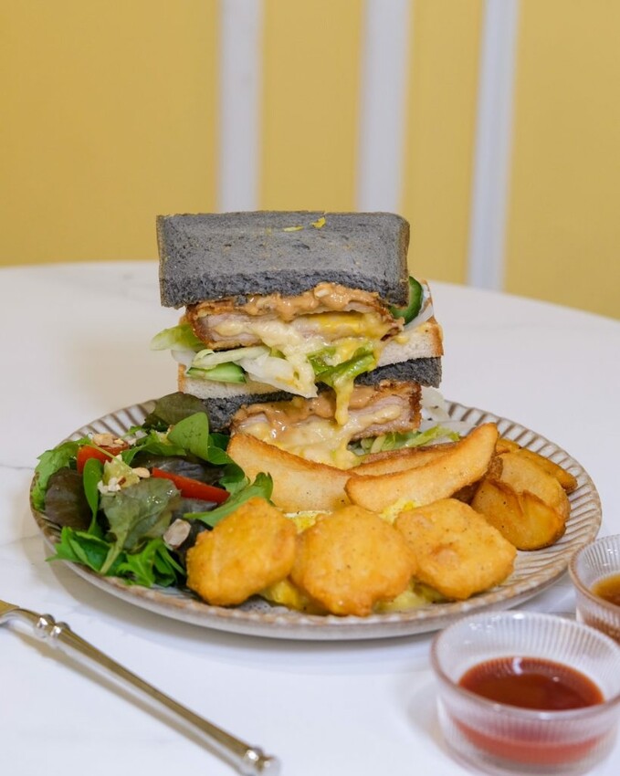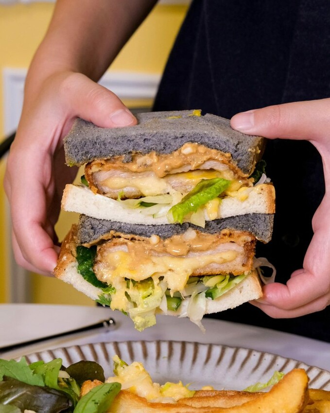 ▼視覺份量十足的起司花花豬, 以竹炭和原味土司層層堆疊,中間的豬排軟嫩鹹香,混合著緩緩流下的起司溶岩瀑布,每口都紮實又讓人滿足,咀嚼時還能吃到顆粒狀的濃郁花生醬。