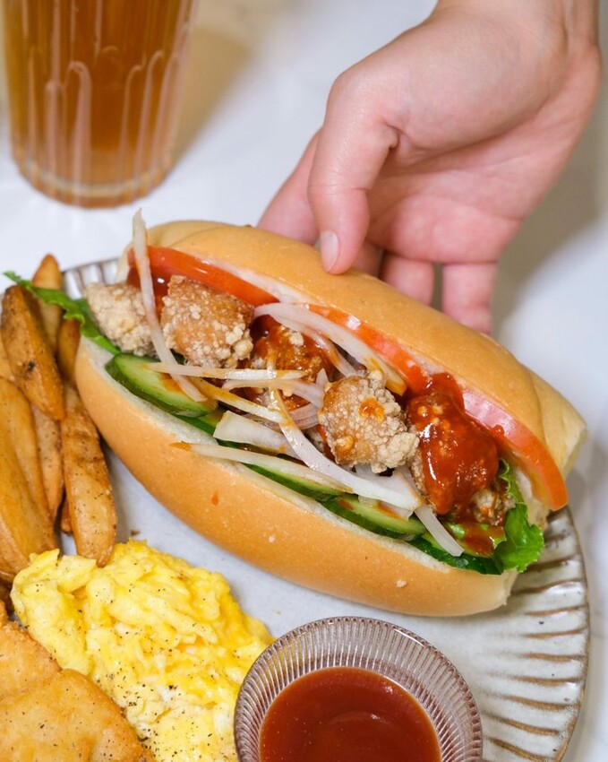 ▼韓辣酥雞堡的餡料多到滿出來,每一口都能吃到滿滿的鹹酥雞,搭配小黃瓜、洋蔥、番茄片帶來清爽感,再淋上韓式辣味醬更加美味涮嘴 。