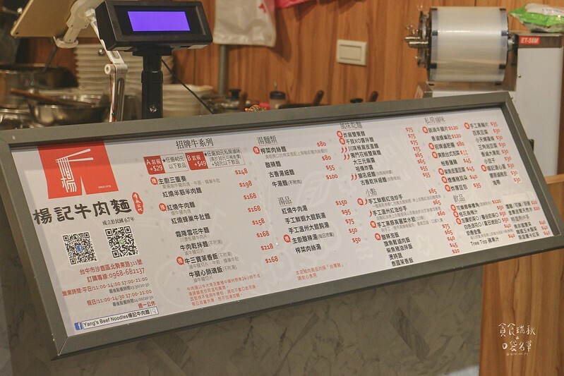 楊記牛肉麵原本是在沙鹿市區,但因為經過祝融之災才搬到現在這個店址,店面裝潢採白色與木質風格,與傳統麵店相比,可說是舒適很多~廚房是開放式格局,看得到作業區域感覺衛生多了~