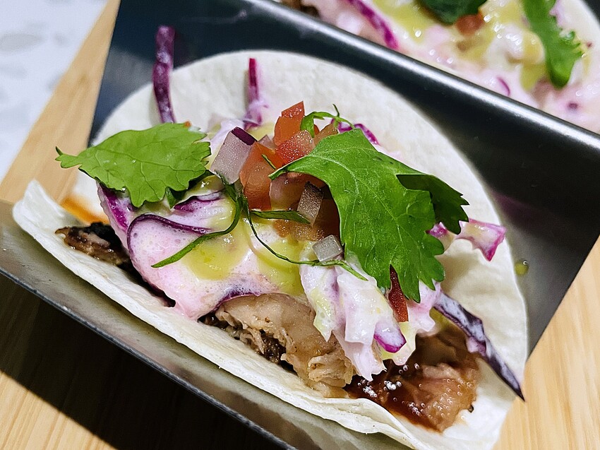 手撕煙燻豬肉塔可放置在造型特殊波浪狀器皿中