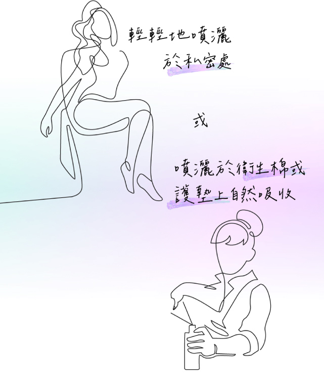 使用方式很簡單,輕輕地噴灑於私密處或衛生棉、護墊上讓其自然吸收即可。