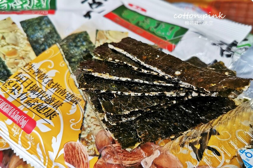 這個杏仁海苔也是一款大人小孩都會喜歡的零嘴,打開禮盒裡面分成兩大包,一大包裡面還有分成四小包~想吃多少開多少就不用怕潤去囉!而且裡面加了杏仁多了堅果香氣更唰嘴~