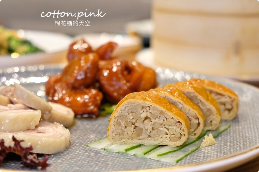 上海燻魚是廚師特製過的,特別把傳統做法的味道調淡一些更適合現代人的口味,吃起來魚肉還帶著一點酥度,一捲一捲的是茶燻素鵝~腐皮的煙燻風味很迷人,裡面有筍絲、金針菇~雖然是素菜但吃起來也是有滋有味。
