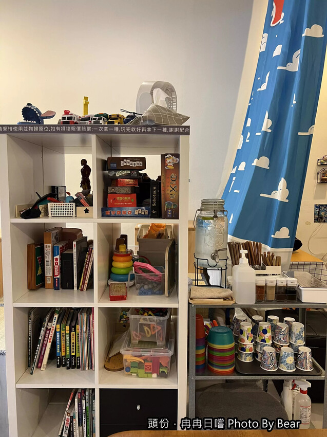 自助區旁的書櫃裡,除了有書,還有積木和多款桌遊