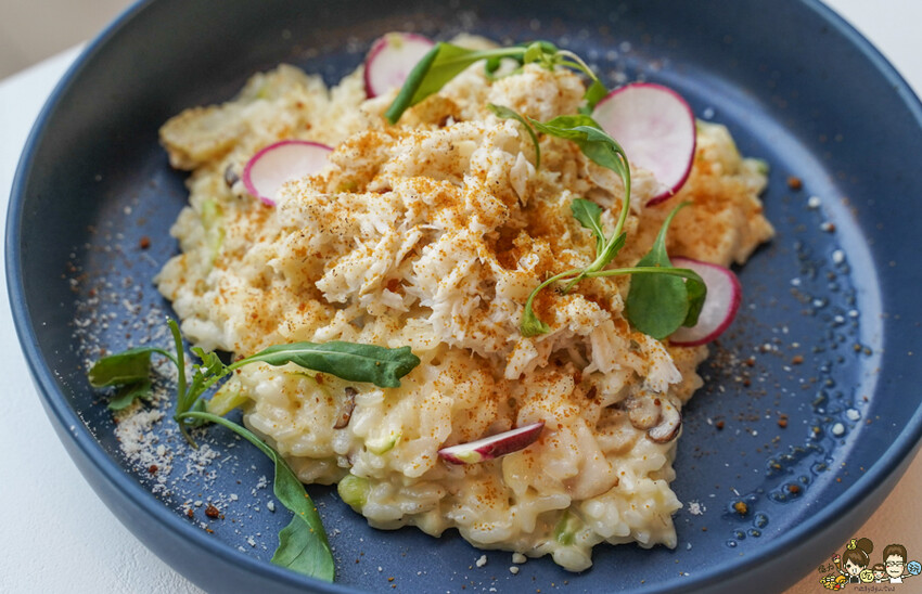 上面堆疊手撕製作的金沙蟹肉,搭配起司奶油燉煮的美味燉飯
