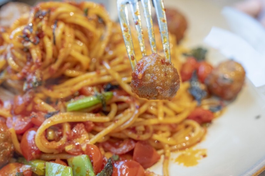 韓國辣醬肉球義大利麵用特製辣醬為基底,搭配手工肉丸、聖女番茄,濃郁的滋味讓人忍不住一口接一口!肉丸的部分吃起來很扎實好吃!