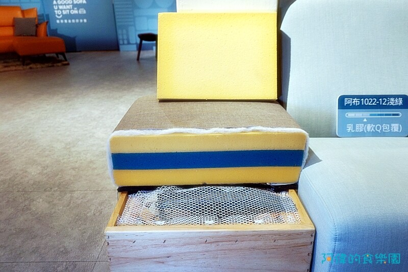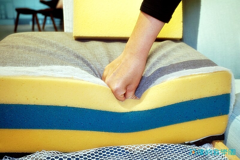 還看到沙發的剖面,裡面有三層高密度泡綿加上「科技乳膠」。
