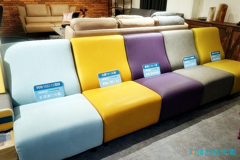 這區則是展示不同材質與顏色的表布,可做成貓抓皮沙發、貓抓布沙發,或是一般的布沙發、皮沙發、機能布沙發等,最重要的是這些沙發有多種風格,例如工業風沙發、日式沙發、北歐風沙發等不同風格滿足你對客廳佈置的需求,到門市實際觸摸更能知道自己的需求。