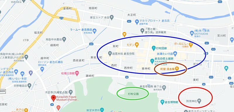 好,從GOOGLE MAP可以看出,町屋清水奄其實離円形劇場其實不算太遠,能走的十來分鐘就到,也可以順便走走下回再分享的「打吹公園」,這裡可是倉吉最有名的賞櫻場所,如果明年春天有帶大家去鳥取的話,一定會帶大家到這來。中間的藍色是倉吉白壁紅瓦老屋集中地,紅色大圈則巴士、計程車會停的地方,一般自駕也都停在周邊的停車場。