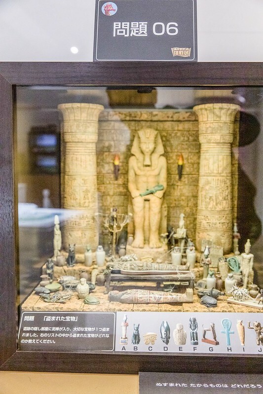 所謂的挑戰狀,就是由海洋堂製作的29問的解謎Q&A,左邊較大的箱子是問題箱,由個種模型組合而成,遊客可以透過右邊小箱子作答,比方說這個埃及金字塔考的是那一樣被偷了?玩了一圈後發現多數是觀察性的遊戲,大抵上都不難,頗適合和小朋友一起動動腦。