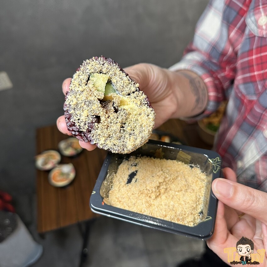 這款壽司內餡有炸蝦和軟殼蟹喔,鮮美的蟹肉、蟹肉棒結合,有多層次的風味喔~