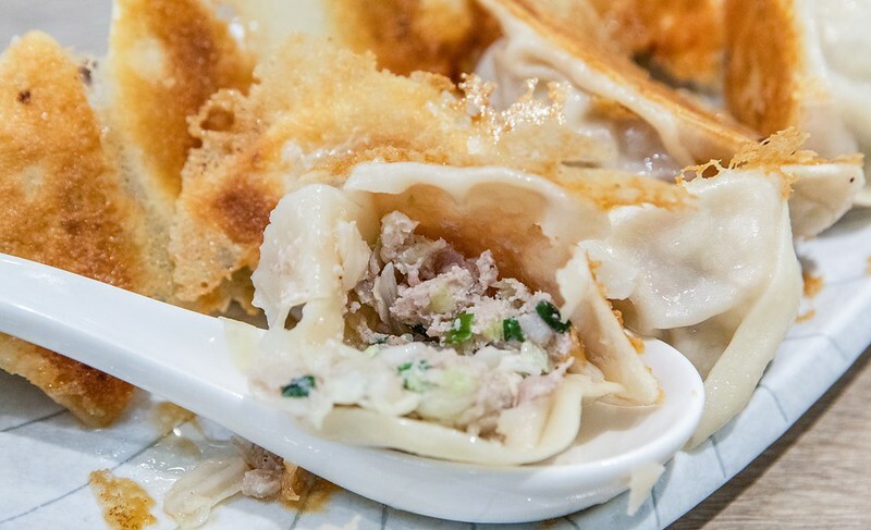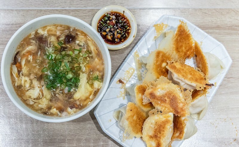 桌上有醬油、醋和兩種特調的鍋貼沾醬,初來乍到盛了一點微辣的辣椒醬油。