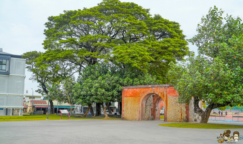 高聳的大樹,旁邊是 阿猴城東門新舊結合一起